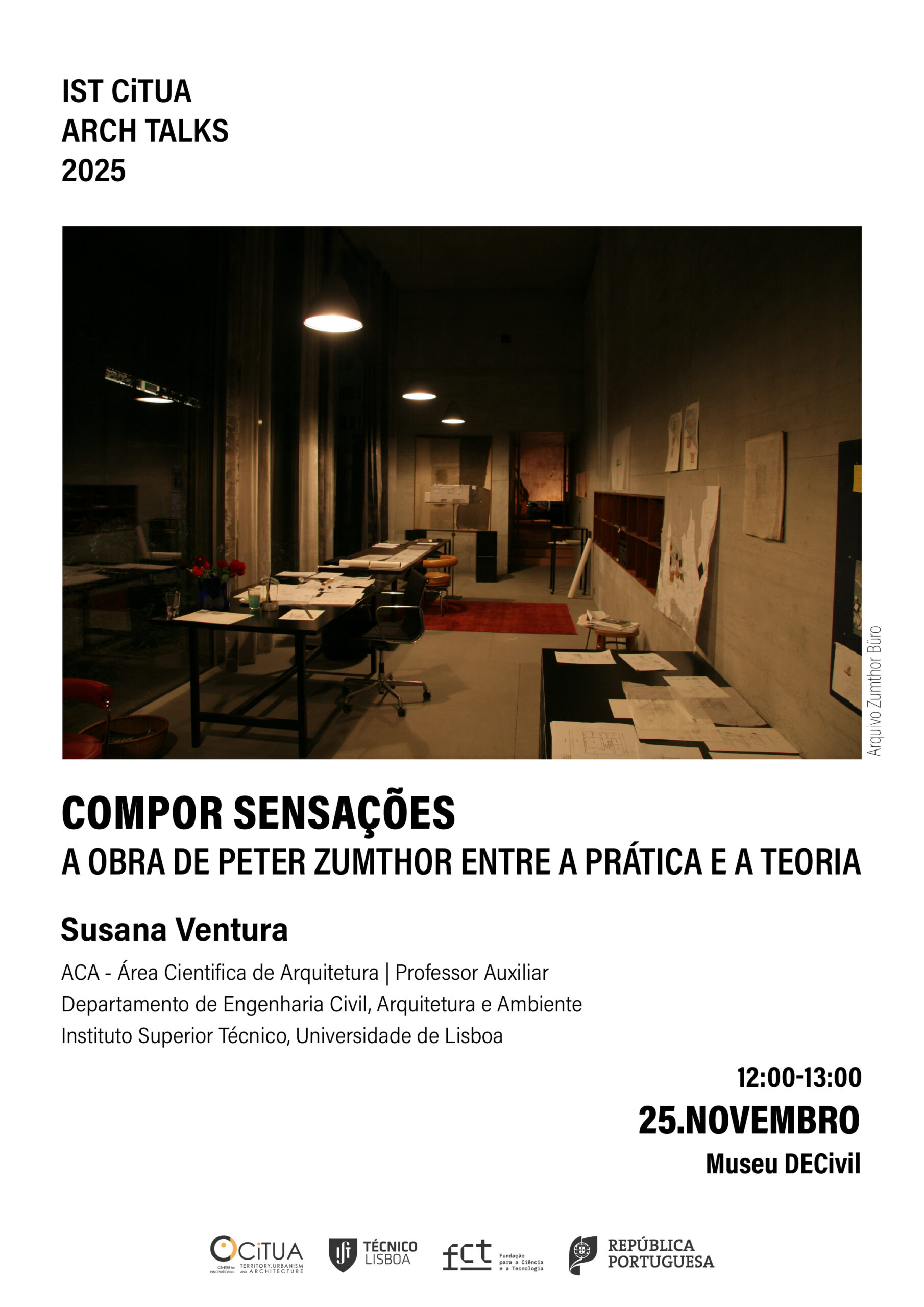 Esta sessão do ARCH Talks, conduzida por Susana Ventura, é intitulada Compor Sensações: a Obra de Peter Zumthor entre a Prática e a Teoria.